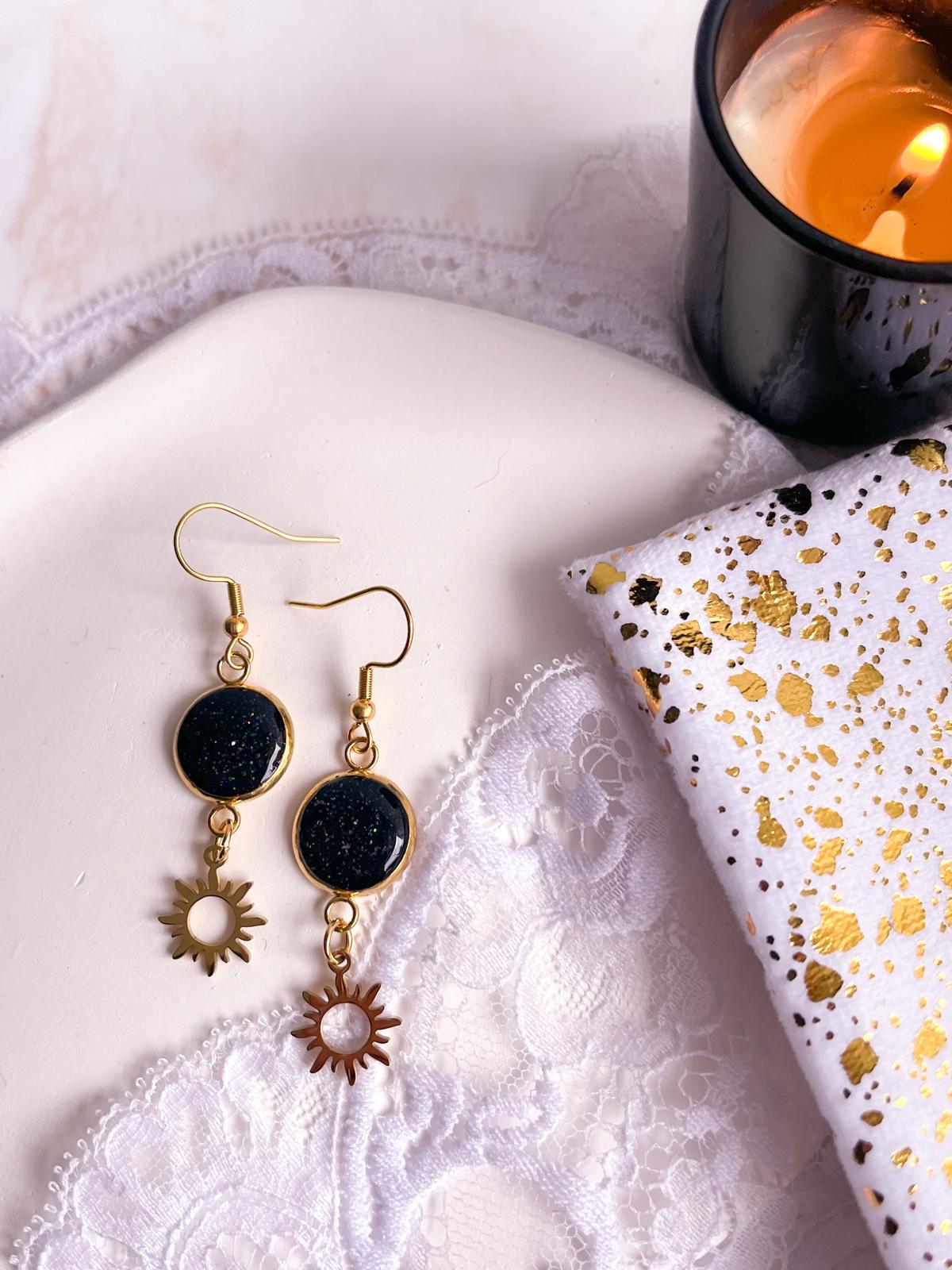 Matériaux : Argile polymère noire, sable de citrine naturelle, résine brillante. Acier inoxydable hypoallergénique (version dorée ou argentée).